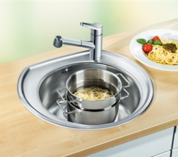цена мойки вполне оправданна – в ней нет никаких дополнительных опций. На фото: мойка BLANCO RONDOVAL фабрики Blanco. Минимальный функционал. Мойка стоимостью около тысячи рублей будет сделана из тонкой нержавеющей стали по технологии штампования, иметь небольшие размеры (50-60 см) и малую глубину чаши — до 15 см. Форма может быть любой: круг, квадрат, прямоугольник. Плюс крылышко. Ближе к верхней границе диапазона, за 4-8 тыс. руб., можно приобрести чуть более «продвинутую» модель. Она тоже будет сделана из нержавейки, но у нее появится маленькое крыло, на которое удобно ставить мокрые чашки и класть только что вымытые овощи и фрукты.