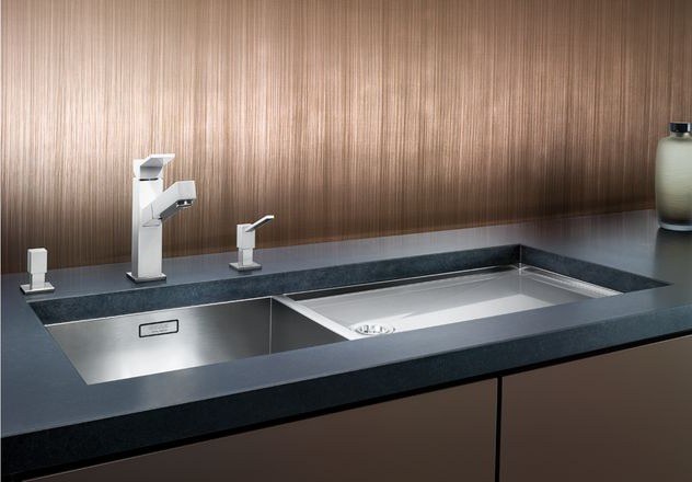 Нулевой радиус закругления создает максимальный полезный объем чаши, а монтаж в один уровень со столешницей позволяет предусмотреть удобное и простое в уходе рабочее место, которое будет красиво смотреться в общем кухонном интерьере.
