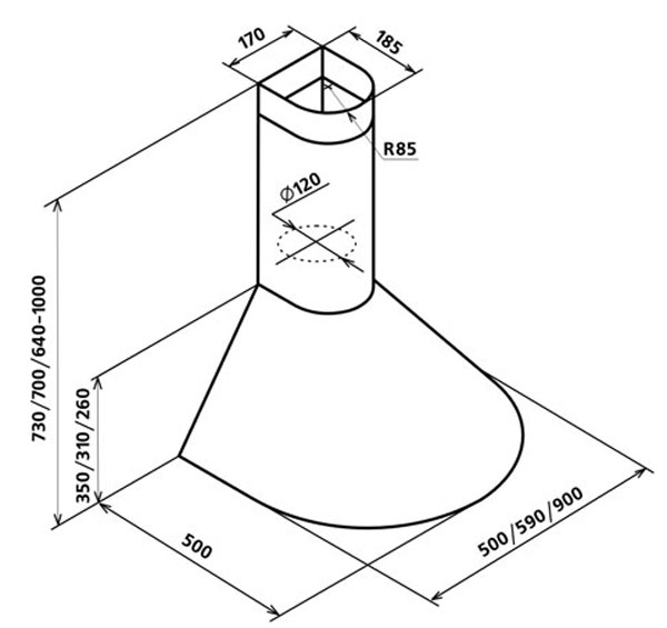 К достоинству вытяжки можно отнести наличие фальштрубы, расположенной чуть выше зонтика. Чехол очень удачно скрывает гофру, идущую от выходного отверстия вытяжки к вентиляционному люку.