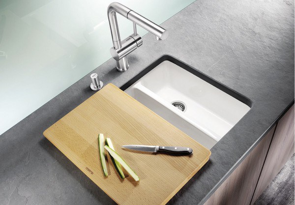 Ухаживать за мойкой для кухни из керамики чрезвычайно легко – она легко моется, не требуя специальных моющих средств, не подвержена царапинам, не окрашивается, не теряют вида от воздействия высоких температур и кислот. Керамика высокого качества от Blanco имеет грязеотталкивающее покрытие PuraPlus.