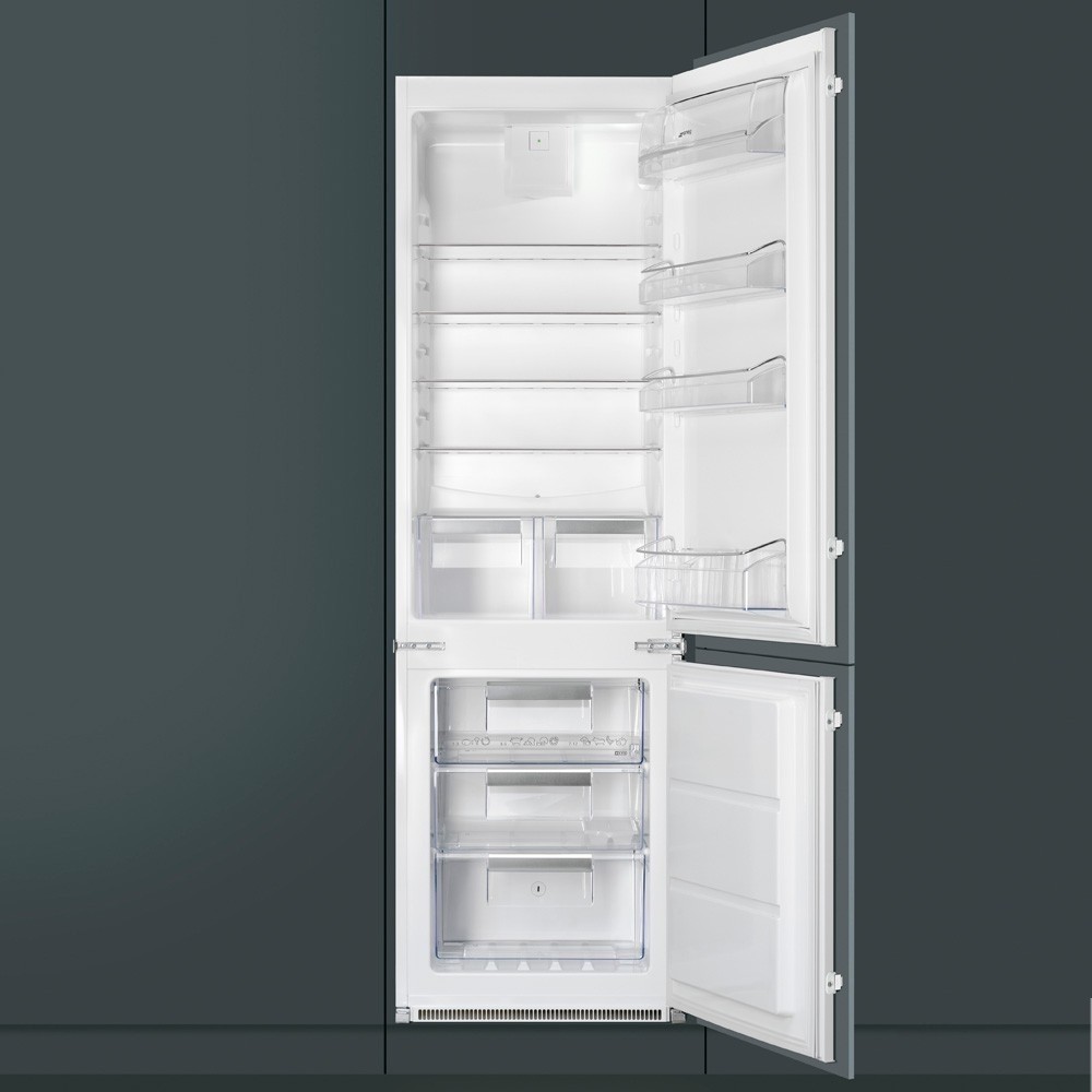 Вместительный встраиваемый холодильник с перенавешиваемыми дверцами объемом 280 литров. Предусмотрена функция принудительной вентиляции и LED-подсветка холодильной камеры.
