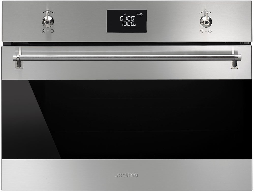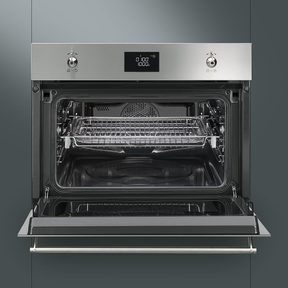 Встраиваемый духовой шкаф Smeg серии Classica SF4390MCX, комбинированный с микроволновой печью, оснащен LСD дисплеем, электронным программатором и функцией блокировки от детей. С помощью гриля можно приготовить блюда с хрустящей корочкой, а размораживание по весу или по времени ускорит приготовление пищи. Благодаря тангенциальному охлаждению можно устанавливать духовку вплотную к другим приборам и мебели. Уникальный режим «Шаббат» позволяет прибору работать до 72 часов без любого взаимодействия с ним.