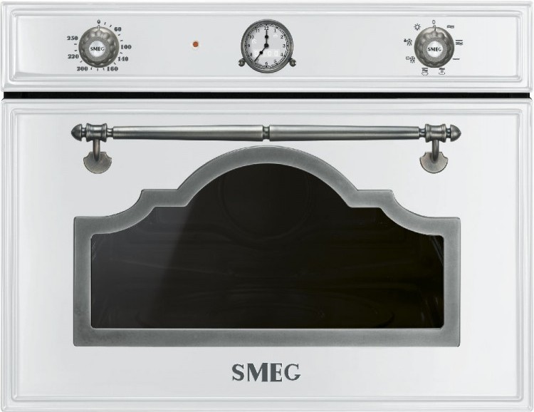 Микроволновая печь Smeg серии Cortina SF4750MBS оснащена аналоговым программатором и функцией блокировки от детей. С помощью гриля можно приготовить блюда с хрустящей корочкой, а размораживание по весу или по времени ускорит приготовление пищи. Благодаря тангенциальному охлаждению можно устанавливать микроволновку вплотную к другим приборам и мебели.