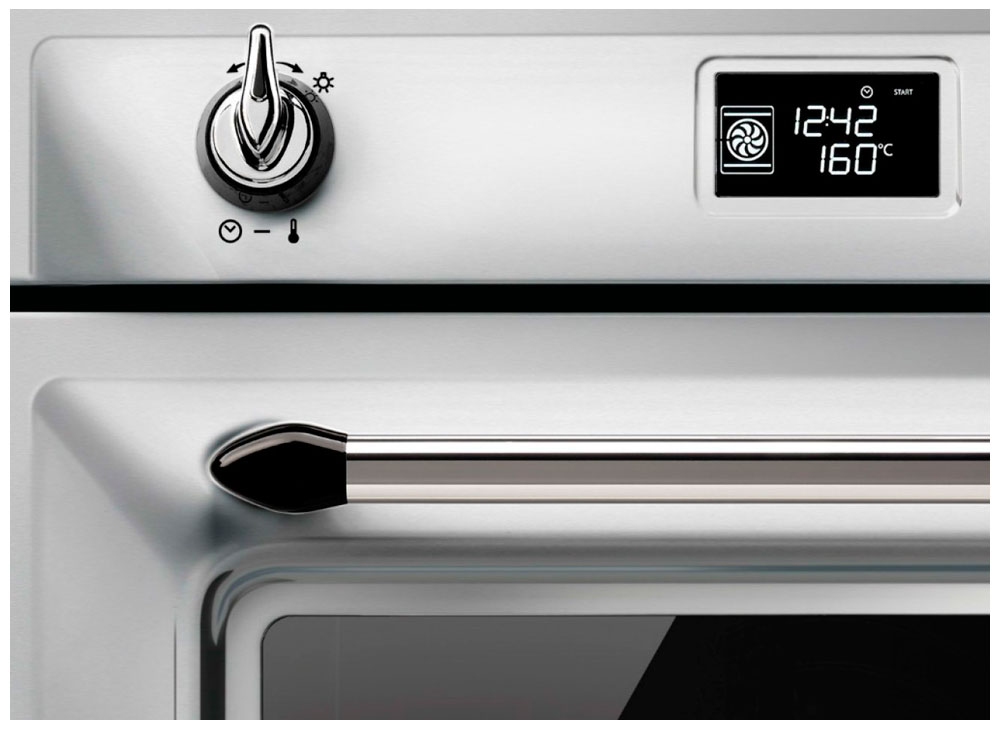 Встраиваемый духовой шкаф Smeg серии Victoria SF6922XPZ оснащен электронным управлением с большим LCD дисплеем и системой тангенциального охлаждения, которая позволяет устанавливать его вплотную к другим приборам и мебели. Благодаря холодному фронту дверцы нет опасности обжечься, а режим Eco дает возможность включать другие электроприборы во время работы духовки. Уникальный режим «Шаббат» позволяет прибору работать до 72 часов без любого взаимодействия с ним.