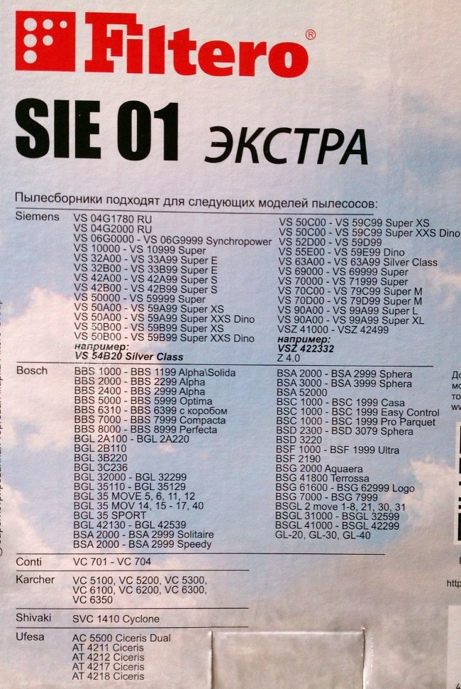 | Мешки для пылесоса SIEMENS | SIEMENS VS 10000 - VS 10999 Super, VS 50000 - VS 59999 Super, VS 69000 - VS 69999 Super, VS 70000 - VS 71999 Super, VS 04G1780 RU VS 06G0000 - VS 06G9999 Synchropower, VS 07G1800 - VS 07G2999 Technopower, например: VS 07G1835 Technopower VS 32A00 - VS 33A99 Super E, VS 32B00 - VS 33B99 Super E, VS 42A00 - VS 42A99 Super S, VS 42B00 - VS 42B99 Super S, VS 50A00 - VS 59A99 Super XS/Super XXS Dino, VS 50B00 - VS 59B99 Super XS/Super XXS Dino, VS 50C00 - VS 59C99 Super XS/Super XXS Dino, VS 55E00 - VS 59E99 Dino, VS 60A00 - VS 62A99 Super M VS 63A00 - VS 63A07 Silver Class/Super C, VS 63A01 - VS 63A06 Super M VS 63A08 - VS 63A09 Super M VS 63A10 - VS 63A99 Silver Class/Super C, VS 70A00 - VS 79A99 Super E например: VS 79A35 Super E VS 70B00 - VS 79B99 Super E VS 70C00 - VS 79C99 Super M, VS 70D00 - VS 79D99 Super M, VS 90A00 - VS 99A99 Super L/Super XL Green Energy, Edition 150, Festiva, Junior 600 |