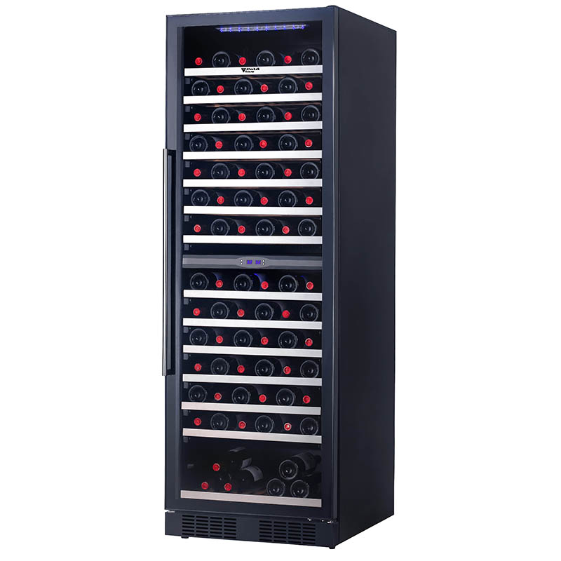 Максимальная вместимость винного шкафа Cold Vine C154-KBT2 составляет 154 бутылки, 77 из которых располагаются в верхней зоне шкафа и 77 в нижней.