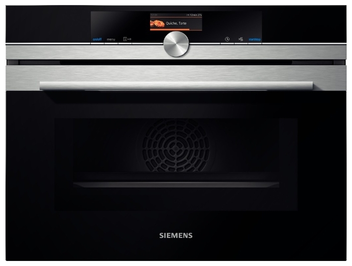 Компактный духовой шкаф с функцией СВЧ Siemens CM636GBS1, объемом 45 л, 13 режимами приготовления, в том числе, комбинированными. Сенсорный TFT дисплей 3,7”, самоочистка ecoClean (задняя стенка), дверца духовки с амортизаторами softMove, LED освещение, 4 стекла.