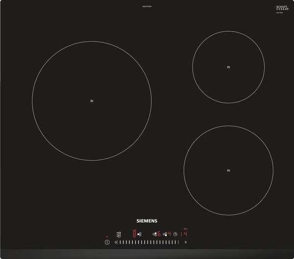 Siemens EU631FCB1E — индукционная варочная панель со скошенным передним краем. Модель оборудована тремя разноразмерными конфорками, каждая из которых дополнена индивидуальным индикатором остаточного тепла. При включении прибора функция quickStart автоматически определяет зону нагрева, на которой расположена посуда, что позволяет моментально начать приготовление.