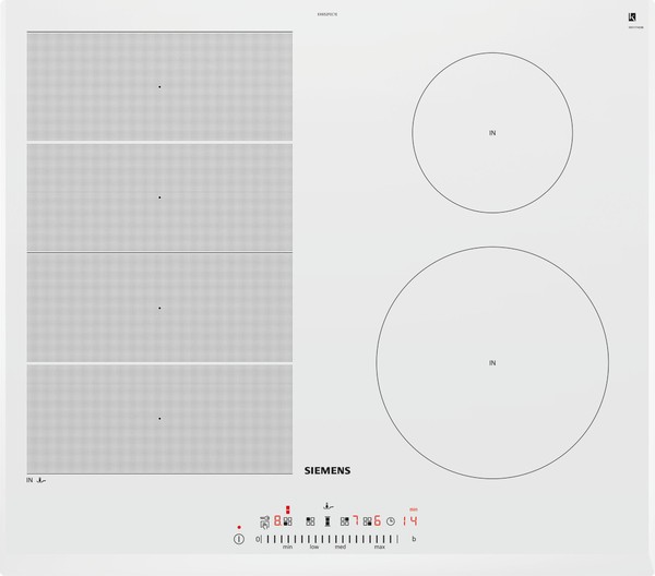 Siemens EX652FEC1E — независимая варочная панель из серии iQ700. Модель изготовлена из стеклокерамики белого цвета — практичного и простого в уходе материала. Гибко настраиваемая зона Flex Zone может использоваться не только как единая нагревательная поверхность, но и в качестве двух независимых друг от друга конфорок.