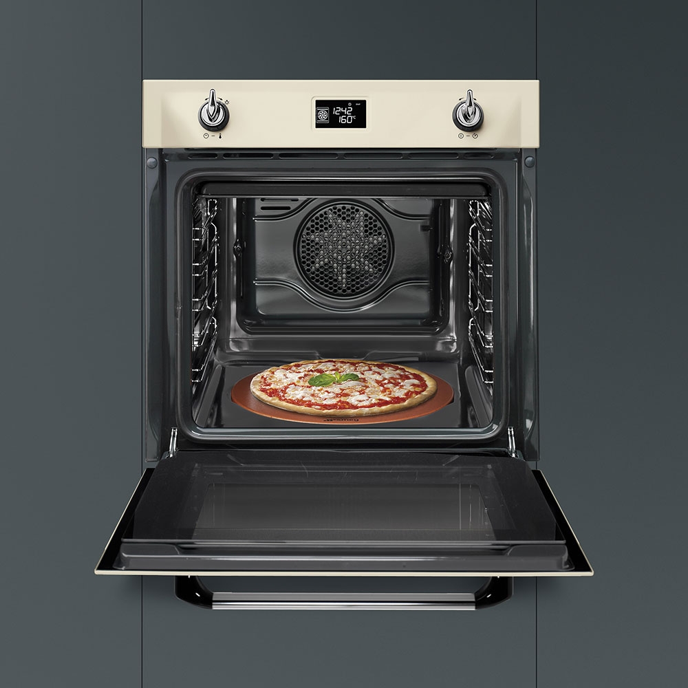Smeg SF6922PPZE — многофункциональный духовой шкаф в элегантном кремовом корпусе. Фронт модели дополнен большим LCD-дисплеем, отображающим температуру нагрева и время приготовления. Для удобства загрузки и извлечения противней предусмотрена система плавного закрывания дверцы Soft Close. Практичная опция ECO-logic ограничивает общее энергопотребление для того, чтобы одновременно с духовкой можно было использовать другие бытовые приборы.