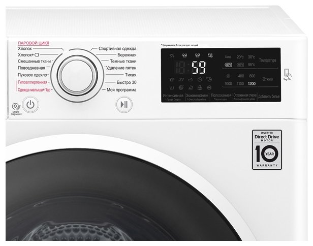 | Специальные программы | стирка деликатных тканей, экономичная стирка, ночной режим, стирка детской одежды, стирка черных вещей, стирка спортивной одежды, программа стирки смешанных тканей, супер-полоскание, быстрая стирка, предварительная стирка, программа удаления пятен, подача пара |