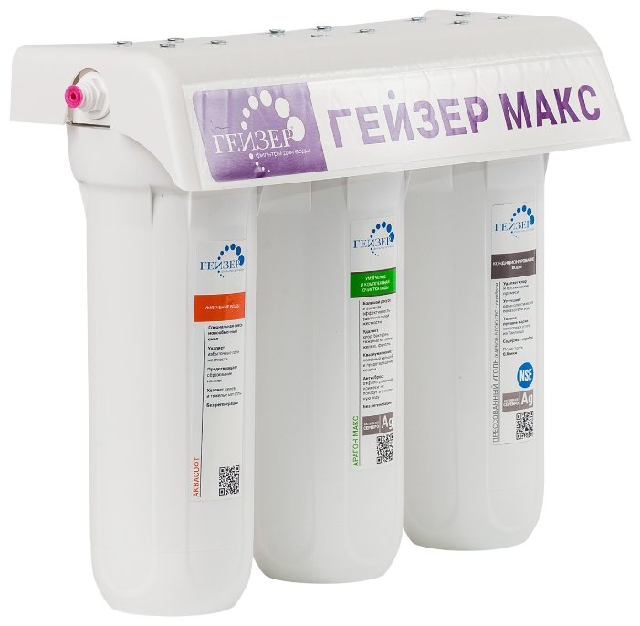 Эргономичный водоочиститель ГЕЙЗЕР Макс эффективно смягчает водопроводную воду и удаляет хлорсодержащие соединения, соли, опасные бактерии за счет высокотехнологичных картриджей АкваСофт, Арагон Макс, СВС Ag. Фильтры разработаны на основе натуральных и композитных микроэлементов, способных задерживать мельчайшие фракции вредных веществ.