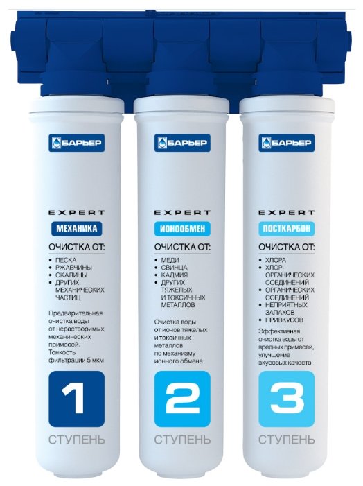 В комплект картриджей Барьер Expert Ferrum включены 3 картриджа. Картридж Механика, имеющий тонкость фильтрации 5 мкм, защищает от частиц песка, ржавчины, окалины и других механических частиц. Картридж Ферростоп также защищает от частиц песка, ржавчины, окалины и разных механических частиц, но дополнительно фильтрует растворенное железо. Тонкость фильтрации картриджа Ферростоп равна 1 мкм. Картридж Посткарбон защищает от хлора, хлор-органических соединений, а также от неприятных привкусов и запахов. Температура очищаемой воды может варьироваться от 5 до 35 °C. Комплект картриджей поставляется в компактной упаковке, на которой содержится подробная информация о свойствах картриджей.