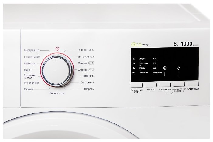 Специальные программыстирка деликатных тканей, экономичная стирка, стирка спортивной одежды, программа стирки смешанных тканей, супер-полоскание, быстрая стирка, предварительная стирка