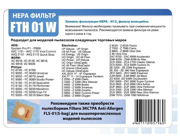 Модель Filtero FTH 01 W предназначается для улучшения степени фильтрации оборудования. Обеспечивается сохранение чистоты воздуха в помещении. Фильтр эффективно задерживает бактерии, пылевых клещей и пыльцу. Изделие легко устанавливается в пылесос и обладает длительным сроком службы.