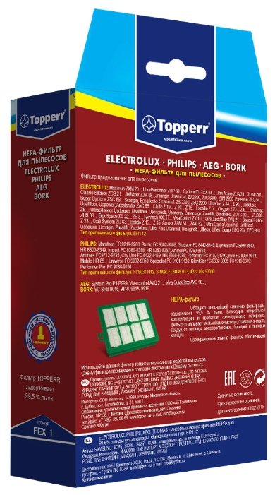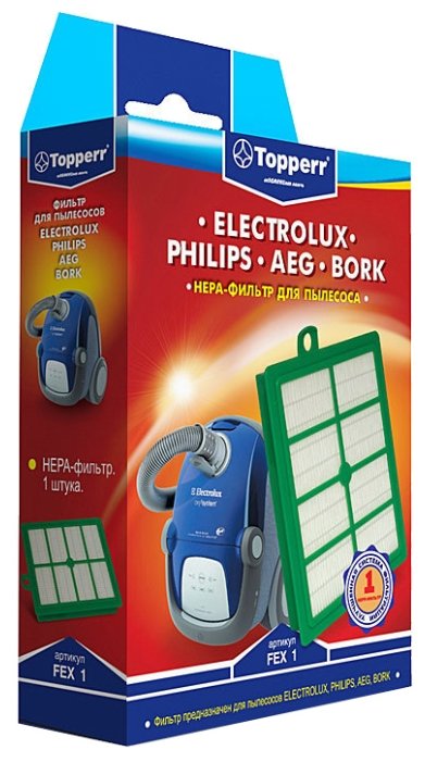 Фильтр Topperr FEX 1 подходит для пылесосов от компаний AEG, Bork, Electrolux и Philips. Использование данного HEPA-фильтра позволит минимизировать возможность попадания пыли обратно в воздух после уборки, так как, по заверению производителя, данный фильтр способен задержать до 99.5 % пыли.