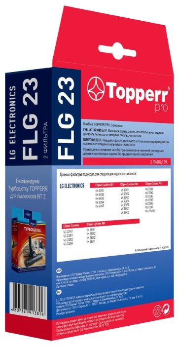 С фильтром Topperr FLG 23 ваш пылесос прослужит вам дольше, а вы сможете поддерживать в доме безупречную чистоту. Ведь предназначение фильтра – защита двигателя пылесоса от быстрого износа, а также удержание мельчайших частиц пыли и грязи, так что вашему дому будут не страшны бактерии и неприятные запахи. Для этого в комплекте идут два фильтра: губчатый и микрофильтр из микроволокна. Данные фильтры используются только совместно с пылесосами бренда LG. Topperr FLG 23 – надежные, экономичные и эффективные в деле сухой уборки.
