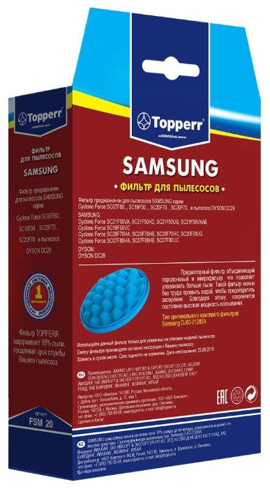 Фильтр Topperr FSM 20 для пылесосов от компании Samsung подходит для многоразового использования, поэтому после его приобретения вы сможете надолго забыть о необходимости приобретения дополнительных фильтров подобного типа. При разработке Topperr FSM 20 было принято использовать особую синтетическую структуру, которая способна уловить самые мелкие частицы пыли.