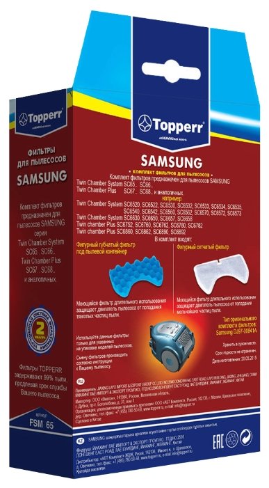 Topperr FSM 65 - многофункциональный комплект фильтров, предназначенных для пылесосов SAMSUNG Twin Chamber SC65, SC66, SC67, SC68. Данные фильтры обеспечат надежную защиту двигателю бытового прибора, что продлит его эксплуатационный срок. Фильтры производятся из синтетического материала. Отличающаяся структура и состав фильтров позволяют им улавливать даже малейшие частицы пыли и мусора, устранять неприятный запах пыли, а также другие неприятные запахи.