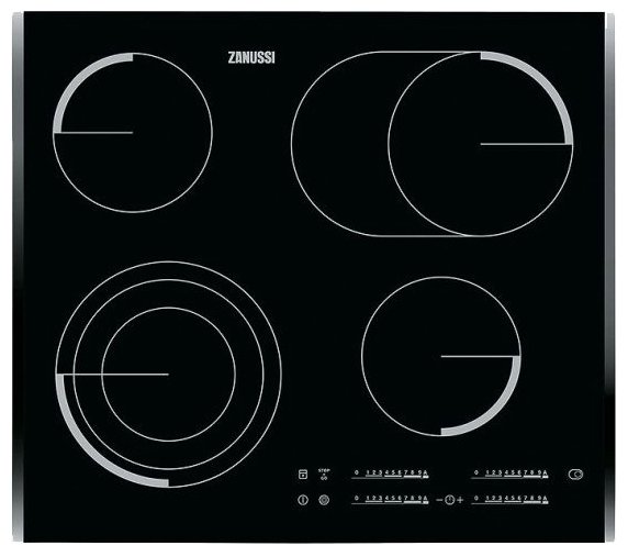 Электрическая варочная поверхность Zanussi CKZ6450KF предоставляет широкие возможности для выбора посуды, в которой можно на ней готовить. Она не только не предъявляет особых требований к материалу, из которого та произведена, но и позволяет использовать продолговатые жаровни и утятницы. Диаметр всех четырех конфорок различен, одна из них трехконтурная.