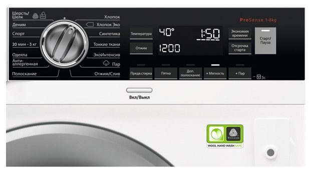 | Специальные программы | стирка деликатных тканей, экономичная стирка, стирка джинсов, стирка спортивной одежды, стирка пуховых вещей, супер-полоскание, быстрая стирка, предварительная стирка, программа удаления пятен, подача пара |