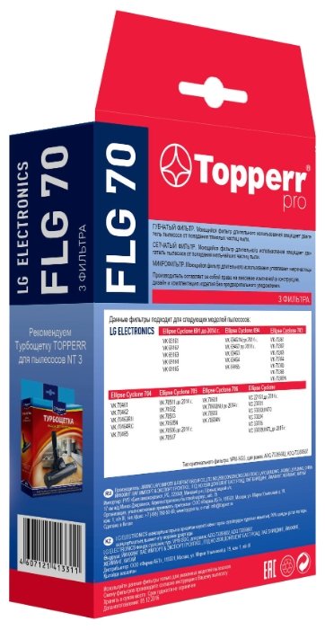 Сетчатый фильтр используется для защиты от частиц пыли двигателя пылесоса. Он эффективно справляется со своими обязанностями в течение долгого времени. Наконец, микрофильтр, выполненный из особого микроволокна, необходим для обеспечения чистоты воздуха в помещении, он задерживает даже самые миниатюрные частицы пыли. Установив на пылесос совместимой модели фильтры из комплекта Topperr FLG 70, Вы обеспечиваете защиту всех деталей пылесоса и абсолютную чистоту воздуха в доме даже после большой уборки.