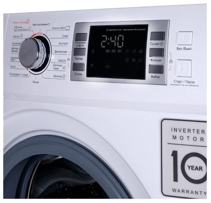 Дополнительная информациярежим "Стирка + Сушка за 1 час", функция "Моя программа", тихий режим; 10 лет гарантии на инверторный двигатель