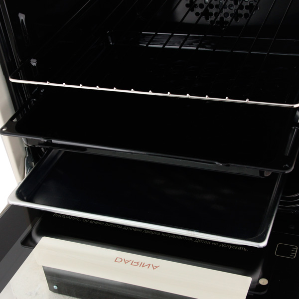 Вместительная духовка (50 литров) отделена двухслойным стеклом, что минимизирует риск обжечься и предотвращает чрезмерный нагрев плиты. Для приготовления самых разнообразных блюд у плиты есть девять режимов работы, включая гриль и конвекцию. Духовка разогревается до 250 градусов, а внутреннее эмалированное покрытие легко чистить.