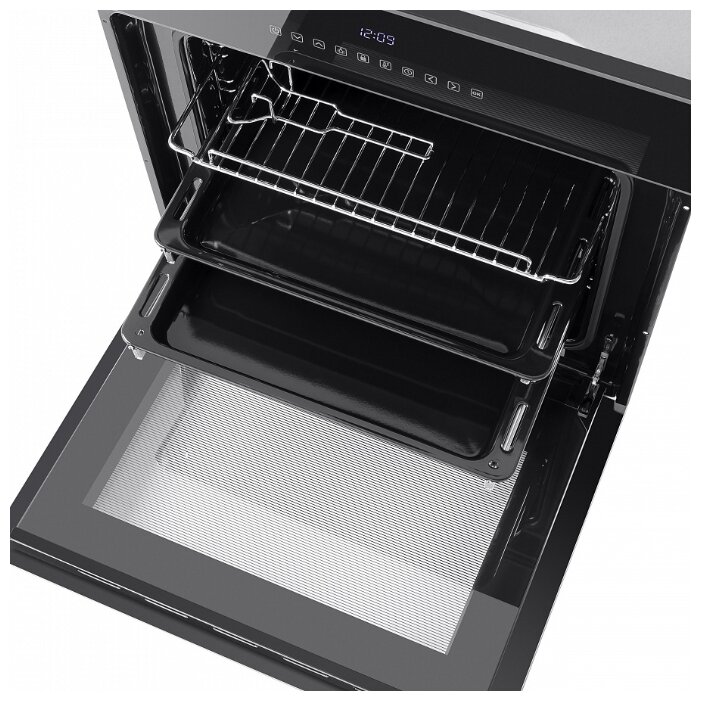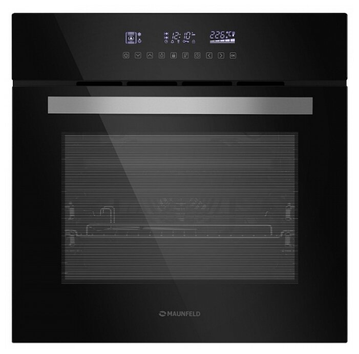 Электрический духовой шкаф MAUNFELD EOEH.5811B лишен поворотных регуляторов: управление устройством производится с помощью сенсорных кнопок. Предусмотрена блокировка от детей. Духовой шкаф имеет 11 режимов работы. Вы, в частности, сможете использовать гриль, конвекцию и программу размораживания. Обращает на себя внимание функция холодного фронта. 58-литровая камера имеет яркую подсветку.