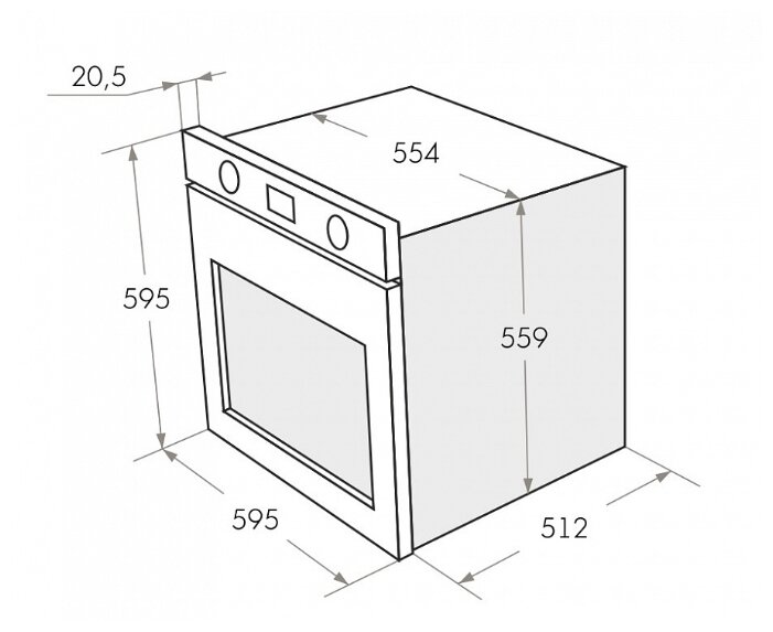 В дизайне духового шкафа сочетаются черный и серебристый цвета. Особенностью комплектации шкафа является наличие ухвата. Также в комплект входят 2 противня и решетка. Ширина и глубина встраивания шкафа равны 55.4 и 51.2 см соответственно. Габаритные размеры шкафа – 59.5x59.5x53.3 см. Масса модели – 37.5 кг.
