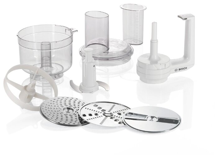В комплект поставки входят емкость для смешивания, нож-крыльчатка, терка для сыра, двусторонний диск-терка и аналогичный диск-шинковка.