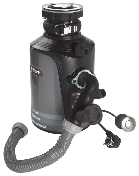 Устройство Bort Alligator Plus действует с мощностью 750 Вт и развивает скорость до 1480 об/мин. Предусматривается наличие полной звукоизоляции и функции ручного перезапуска для защиты системы от перегрузок. Прибор весит 9 кг, а его габариты составляют 35x19 см. Комплектация состоит из монтажного узла, пневмовыключателя, проталкивателя и сливной трубы.