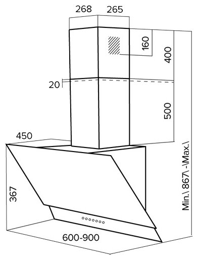 Белое стекло, вертикальная форма, сенсорная панель управления, 3 скорости, таймер остановки работы, двигатель с экранированными полюсами, индикация загрязнения фильтра, индикация работы, светодиодные лампы 2 X 20В, максимальная производительность 500 м/ч, 3-хслойные алюминиевые фильтры, переходник 150/120 мм, европейская вилка входит в комплект, громкость звука (UNE-EN 60704-2-13): 51 дБ.