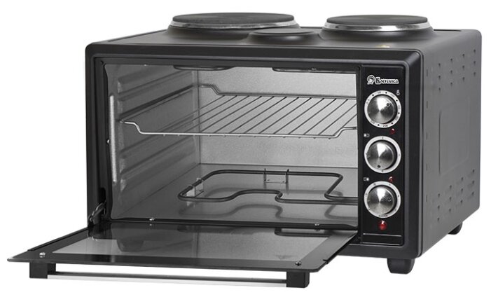 В конструкции электропечи Василиса ВС-2К39 присутствуют две конфорки мощностью 1000 Вт и 1500 Вт соответственно. Мощность духового шкафа достигает 1300 Вт, благодаря чему обеспечивается равномерное пропекание готовящегося в нем блюда без пригорания. Вы сможете настроить температуру готовки в диапазоне от 50 до 320 градусов. Особенностью данной модели стала функция автоотключения: она активируется при достижении максимального уровня температуры и длительном простое устройства в рабочем состоянии.