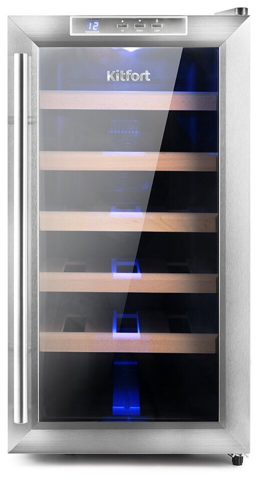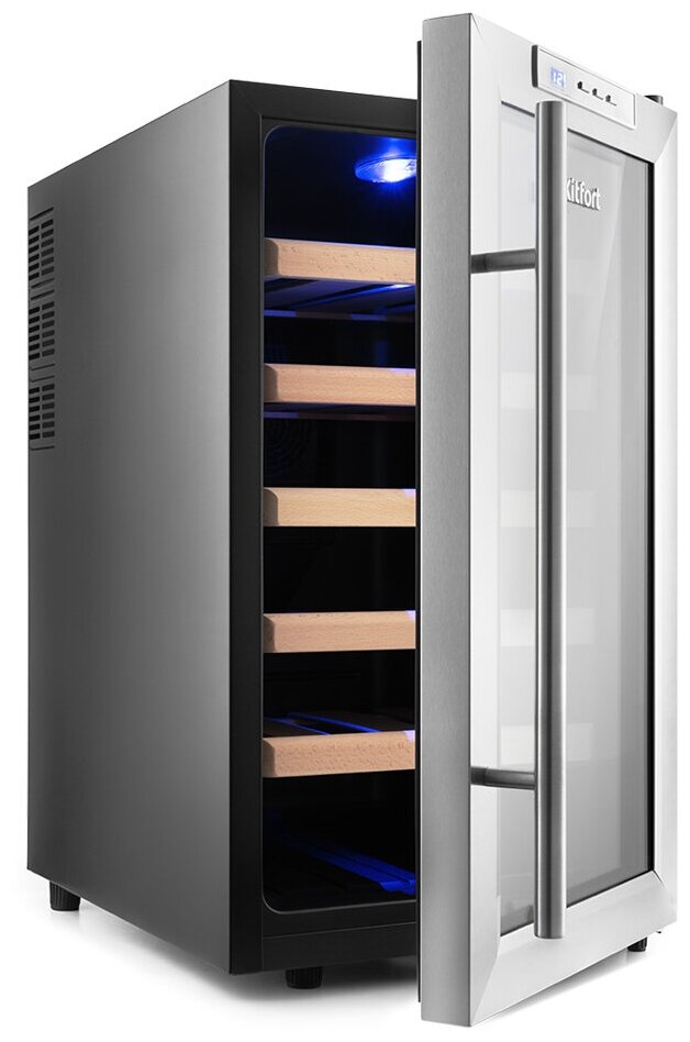Полки винного шкафа KITFORT КТ-2409 произведены из дерева, которое считается одним из самых экологичных и красивых материалов. Поэтому внутреннее пространство модели выглядит стильно и сможет легко впечатлить присутствующих на кухне гостей. Полная защита вина от ультрафиолета обеспечивается дверцей с тонированным стеклом. Поэтому модель нет необходимости специально размещать подальше от солнечного света в затемненном месте. Температуру внутри камеры можно регулировать, выставив значение от 10 до 18 градусов, что позволяет хранить в шкафу практически все сорта вин.
