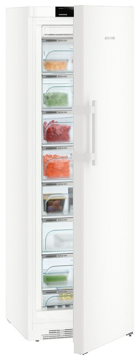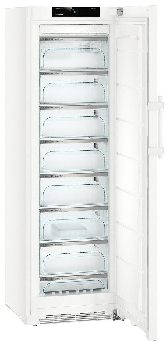 В морозильнике Liebherr отлично продуманная система выдвижных ящиков. Они оснащены телескопическими шинами и выкатными роликами, благодаря чему вы без труда откроете даже переполненный отсек. Самый нижний ящик специально рассчитан на мороженое, ягоды или другие мелкие продукты. Система NoFrost гарантирует равномерное замораживание без образования инея.