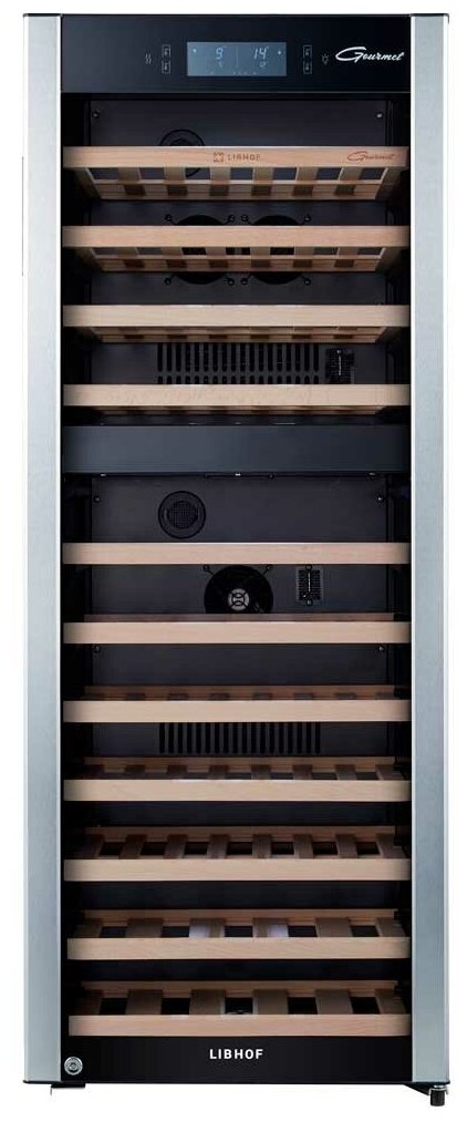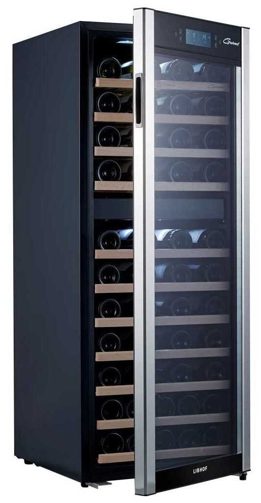 Двухзонный шкаф премиум класса GPD-73 может использоваться для охлаждения вина перед подачей, длительного хранения или созревания винной коллекции. Модель рассчитана на размещение в ней до 73 бутылок вина стандартного объема 0, 75 л. Современный компрессор обеспечивает низкий уровень вибраций. На полках из твердых пород дерева не образуется конденсат, что позволяет сохранить этикетки бутылок в первоначальном виде. Современное светодиодное освещение не является источником тепла и сохраняет электроэнергию. На двери установлен тонированный стеклопакет, препятствующий проникновению света и сохраняющий свойства благородного алкоголя. Сменный угольный фильтр служит для устранения посторонних запахов, проникающих внутрь холодильника через систему естественной вентиляции. Для предотвращения высыхания пробки в шкафу сохраняется влажность более 50%. Это позволяет бутылкам с вином храниться в течение долгих лет. Благодаря "зимнему" режиму прибор можно устанавливать даже в помещениях с низкой температурой. В таких случаях у винного шкафа включается режим подогрева камеры. Управление параметрами работы модели производится при помощи сенсорных кнопок и ЖК-дисплея с цифровой индикацией температуры.