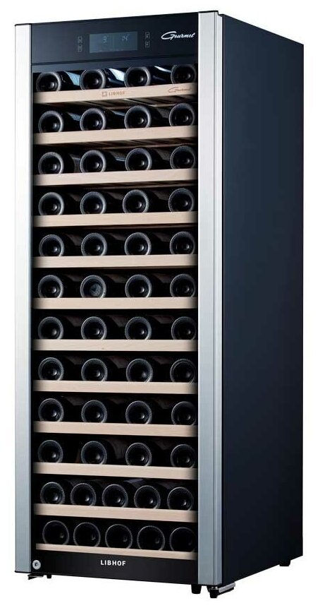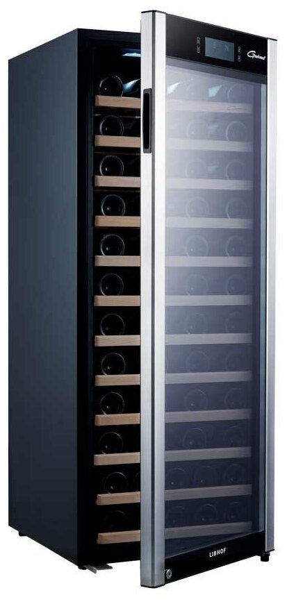 Монотемпературный шкаф премиум класса GP-80 может использоваться для охлаждения вина перед подачей, длительного хранения или созревания винной коллекции. Модель рассчитана на размещение в ней до 80 бутылок вина стандартного объема 0, 75 л. Современный компрессор обеспечивает низкий уровень вибраций. На полках из твердых пород дерева не образуется конденсат, что позволяет сохранить этикетки бутылок в первоначальном виде. Современное светодиодное освещение не является источником тепла и сохраняет электроэнергию. На двери установлен тонированный стеклопакет, препятствующий проникновению света и сохраняющий свойства благородного алкоголя. Сменный угольный фильтр служит для устранения посторонних запахов, проникающих внутрь холодильника через систему естественной вентиляции. Для предотвращения высыхания пробки в шкафу сохраняется влажность более 50%. Это позволяет бутылкам с вином храниться в течение долгих лет. Программа обогрева гарантирует сохранение необходимой температуры внутри шкафа даже при очень низких значениях комнатной температуры. Управление параметрами работы модели производится при помощи сенсорных кнопок и ЖК-дисплея с цифровой индикацией температуры.
