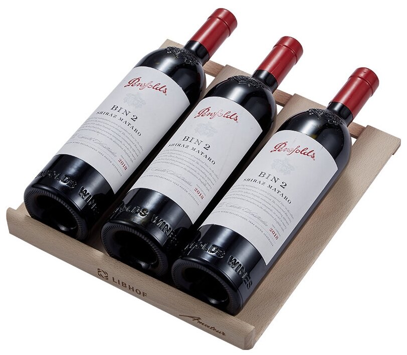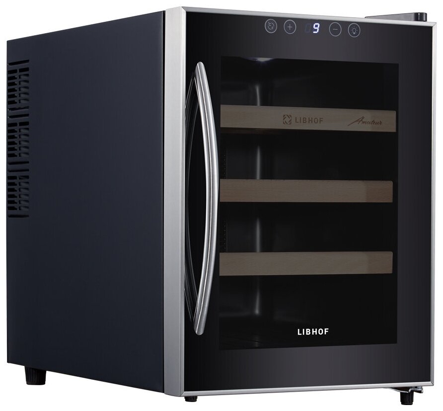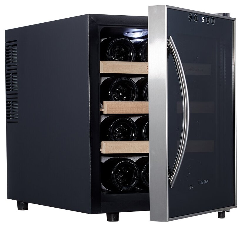 Монотемпературный шкаф Libhof AM-12 отвечает всем требованиям для идеального хранения вина. Термоэлектрическая система охлаждения гарантирует очень низкий уровень шума, равный всего 25 дБ, и практически полное отсутствие вибраций. Чтобы пробки не рассыхались, и в вино не попадал кислород, бутылки кладутся горизонтально на три съемных полки из массива бука. Сенсорные кнопки управления расположены прямо на дверце. Возможна высокоточная регулировка температуры, вплоть до 1 градуса. Дверное стекло тонировано, что позволяет сберечь благородный напиток от действия УФ-лучей. Освещение белого цвета плавно включается при открывании дверцы, а через пару секунд после закрытия плавно гаснет.