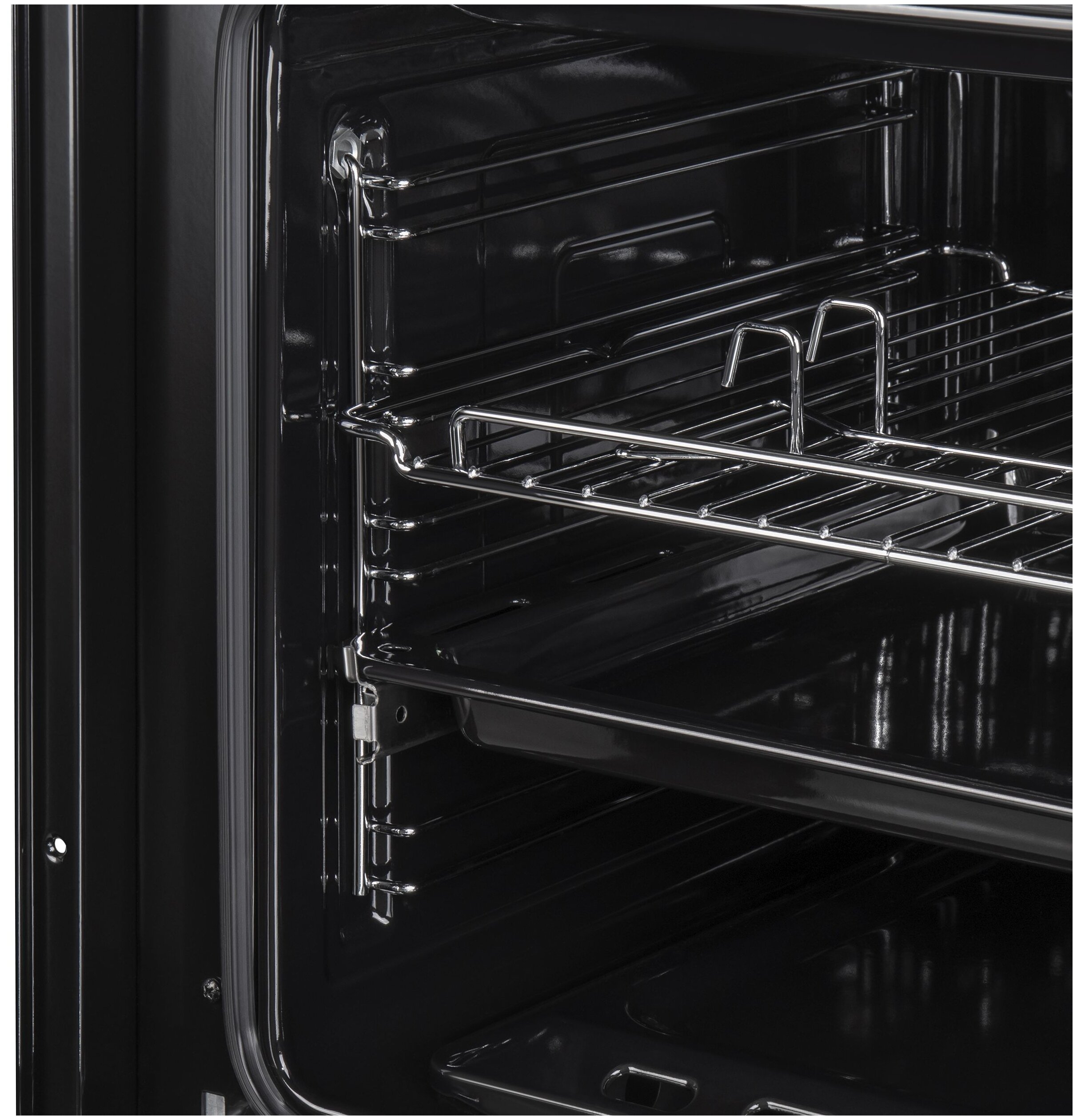 Внутреннее покрытие камеры выполнено из специальной легкоочищающейся эмали черного цвета. Механическое управление осуществляется цельнометаллическими поворотными ручками. Можно выставить температуру готовки, установить таймер (0-55 мин) и выбрать один из 5 режимов работы: нижний газовый нагрев с вентилятором, традиционная готовка, вентилятор, освещение. Данная модель работает как при открытом, так и при закрытом гриле. Надежность духового шкафа обеспечивается полным газ-контролем – система, которая перекрывает подачу газа, если потух огонь. Автоматический электроподжиг является дополнительным преимуществом этой модели.