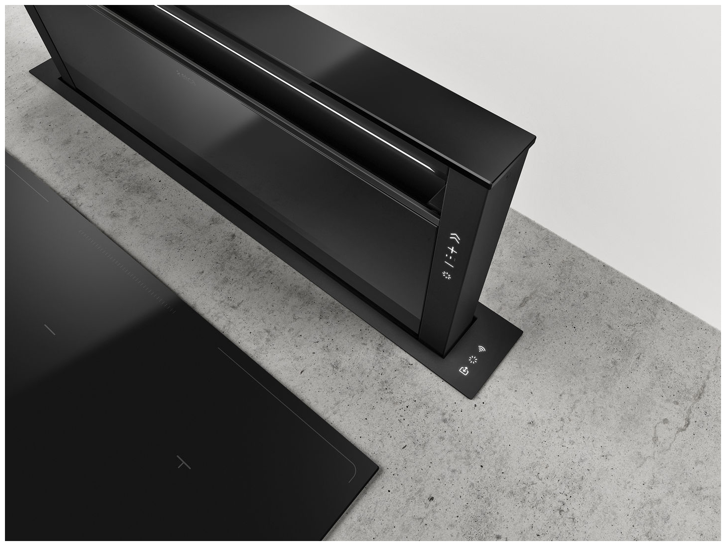 Взаимодействие с системой Getup невероятно естественно и продуманно, благодаря боковому эргономичному сенсорному управлению и безопасному движению выхода и возврата блока вытяжки, плавному и бесшумному.