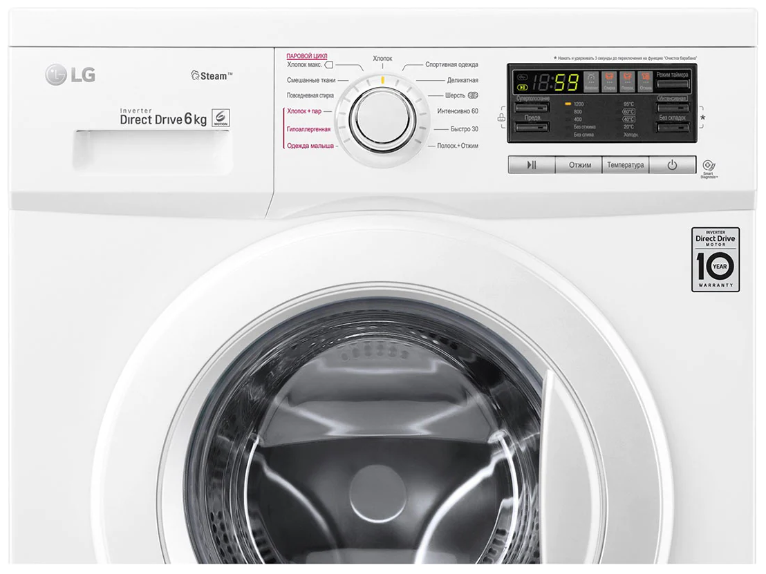 Работает машина тихо за счет системы прямого привода Inverter Direct Drive. Максимальный объем загрузки 6 кг, а скорость отжима равна 1200 об/мин. Возможно осуществление мобильной диагностики по системе Smart Diagnosis. Есть отсроченный старт стирки на время от 1 до 24 ч. Имеется контроль перелива и уровня пены. Регулируемые ножки минимизируют вибрацию при отжиме.