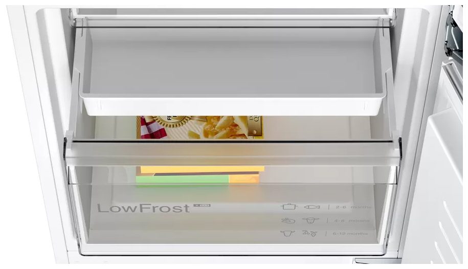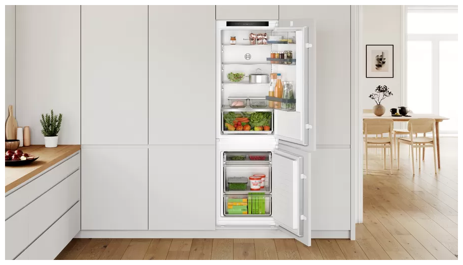 Встраиваемый холодильник Bosch KIV86VS31R с 267 л общего объёма вместимости и система свежести VitaFresh обеспечивают гораздо больший объем хранения и длительную свежесть ваших блюд. Морозильная камера (83 л) находится снизу и оборудована выдвижными ящиками, в которых очень удобно размещать продукты. Режим «Суперзаморозка» позволит моментально замораживать заготовки из ягод, фруктов, мяса, рыбы, сохраняя их вкусовые и полезные качества. Холодильник оснащен удобным дисплеем, благодаря чему можно легко управлять рабочими режимами и контролировать правильность работы агрегата. При оставлении дверцы холодильника открытой срабатывает звуковая индикация.