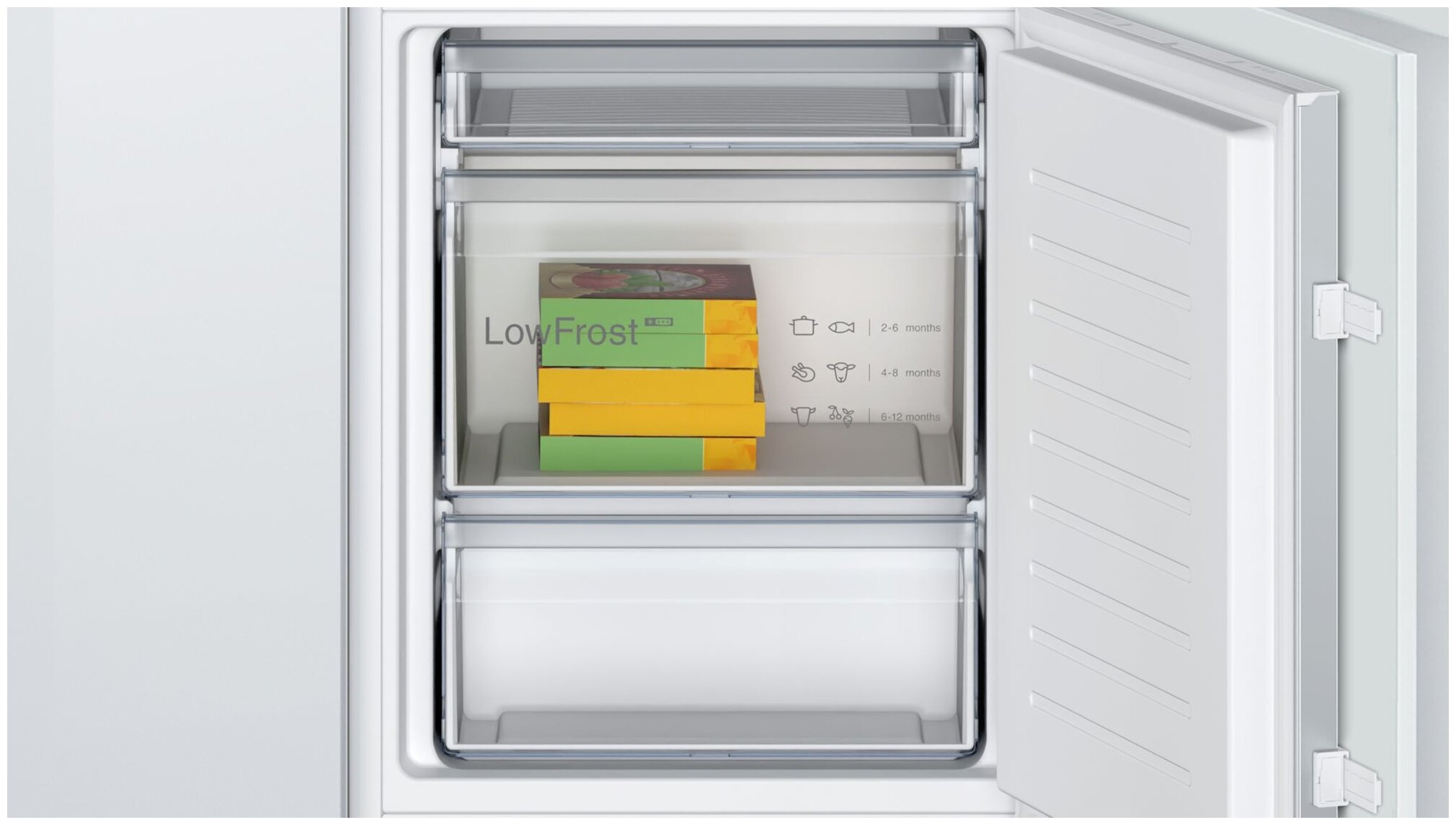 Встраиваемый холодильник с нижней морозильной камерой общим объемом 265 л.  и ящиком для овощей и фруктов MultiBox предоставляет больше пространства для хранения продуктов.