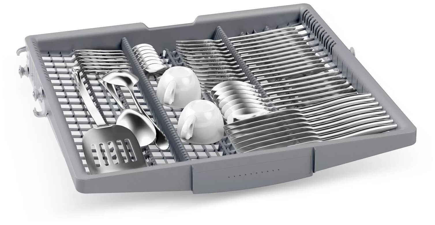 Система регулировки по высоте Rackmatic поможет оптимизировать пространство посудомоечной машины под ваши индивидуальные потребности. Даже полностью загруженный верхний короб можно с легкостью переставлять по высоте на 3-х уровнях шагом до 5 см, нажав на рычажки, расположенные по бокам короба.