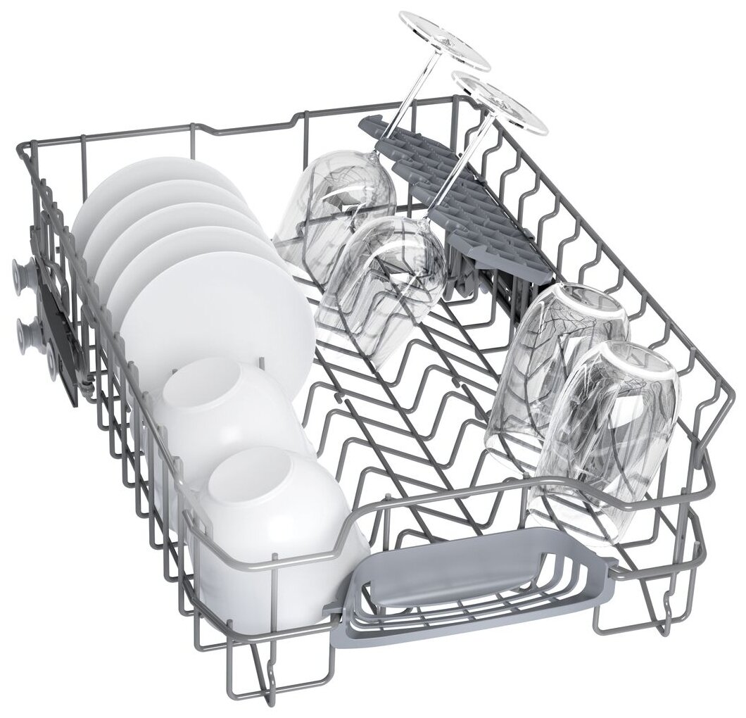 Система регулировки по высоте Rackmatic поможет оптимизировать пространство посудомоечной машины под ваши индивидуальные потребности. Даже полностью загруженный верхний короб можно с легкостью переставлять по высоте на 3-х уровнях шагом до 5 см, нажав на рычажки, расположенные по бокам короба.
