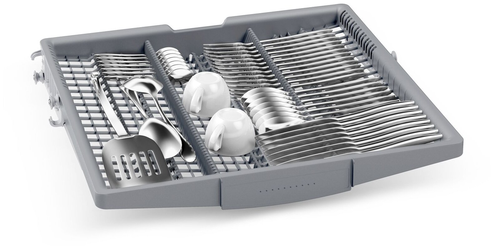 Вместительный выдвижной ящик VarioDrawer позволяет обойтись без отдельной корзины для столовых приборов, обеспечивая оптимальное использование пространства  - теперь есть возможность разметить до 14 комплектов посуды (в моделях шириной 45 см - до 10 комплектов)