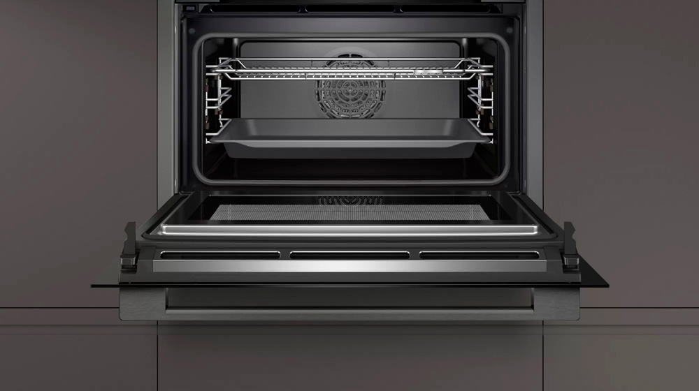 Духовка Нефф C17MS22G0 оснащена двумя видами очистки. На задней стенке находится панель EcoClean, капли жира, попавшие на нее, разлагаются при нагревании на воду и углекислый газ. Функция Easy Clean позволяет поддерживать внутреннее пространство в чистоте. Нужно добавить в 0,4 литра воды каплю моющего средства и вылить раствор на дно рабочей камеры, а затем включить режим самоочистки. Все загрязнения легко размягчаются и их легко удалить без оттирания.