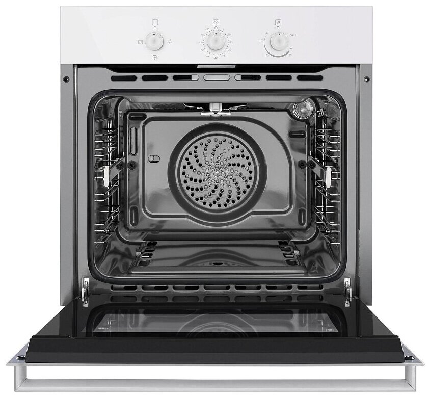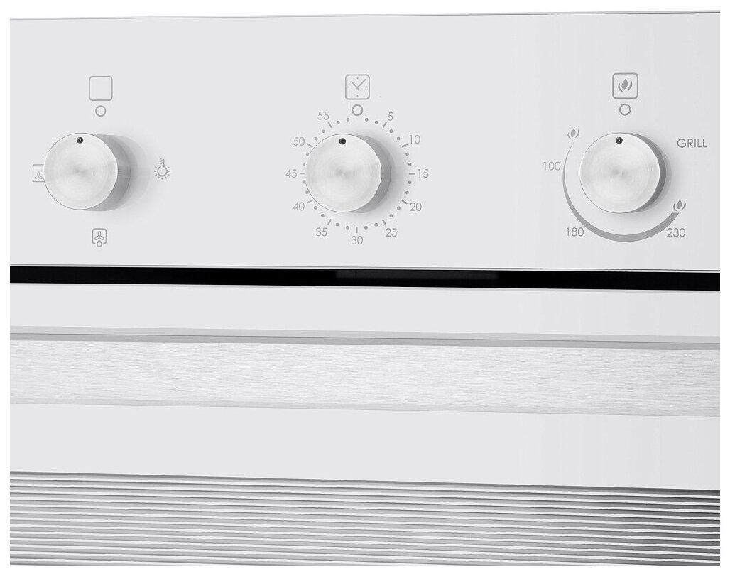 Для управления MAUNFELD MGOG.673W используются три поворотные ручки, размещенные в верхней части корпуса над дверцей. С их помощью вы сможете настроить таймер, температуру, а также выставить нужный режим работы устройства. Реализованная в духовке, функция «Газ-контроль», обеспечивает безопасную его эксплуатацию: при затухании пламени прекращается автоматически подача газа. Вместительность камеры духовки соответствует 67 л.