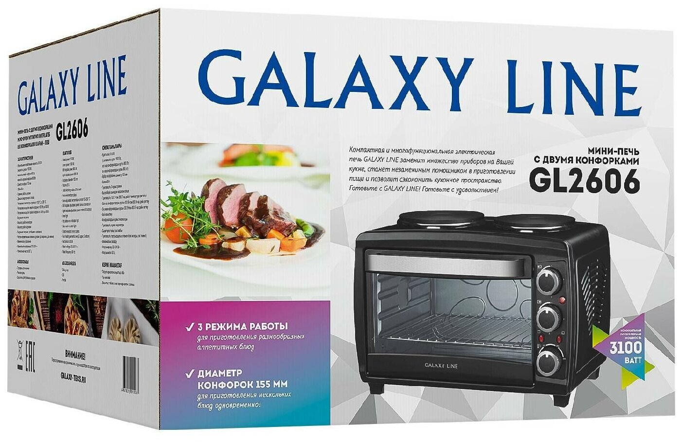 Мини- печь с двумя конфорками GALAXY LINE GL2606 - многофункциональный прибор, который заменит множество техники на Вашей кухне.